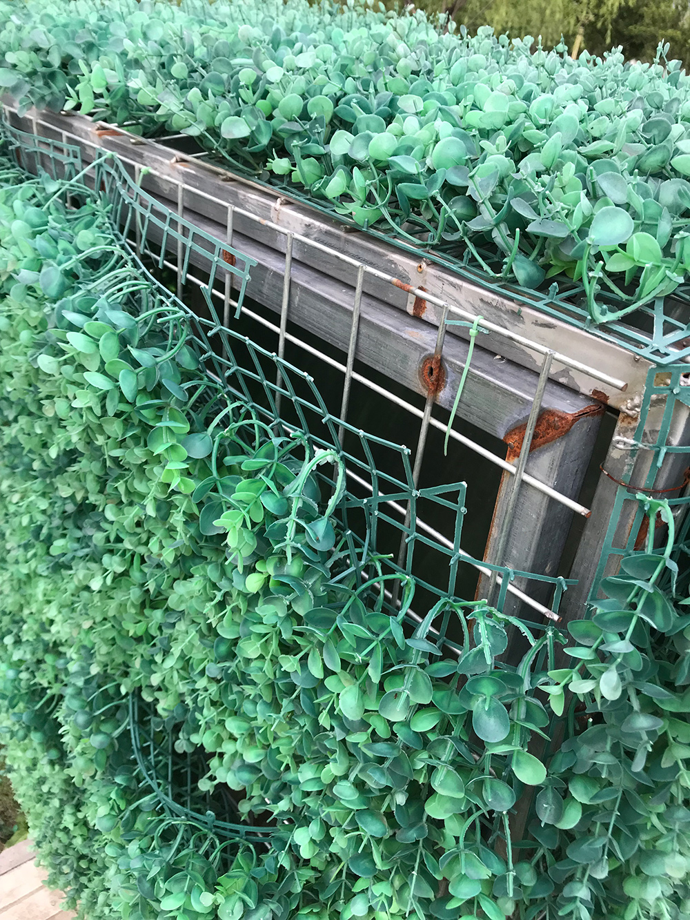 大型變電箱綠植裝飾,歷經(jīng)4年半,色彩沒有明顯變化,葉片也沒有明顯的掉落